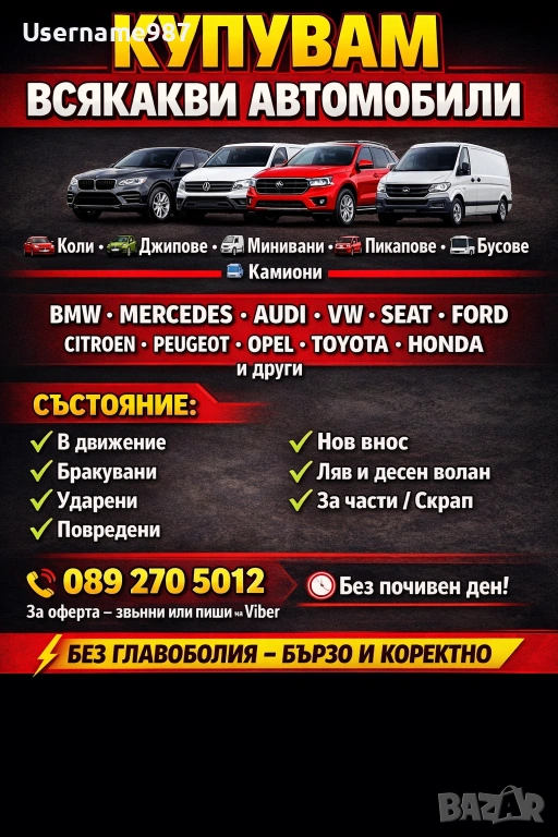- Година със кратко описание на автомобила или директно изпратете снимки на Вайбър.