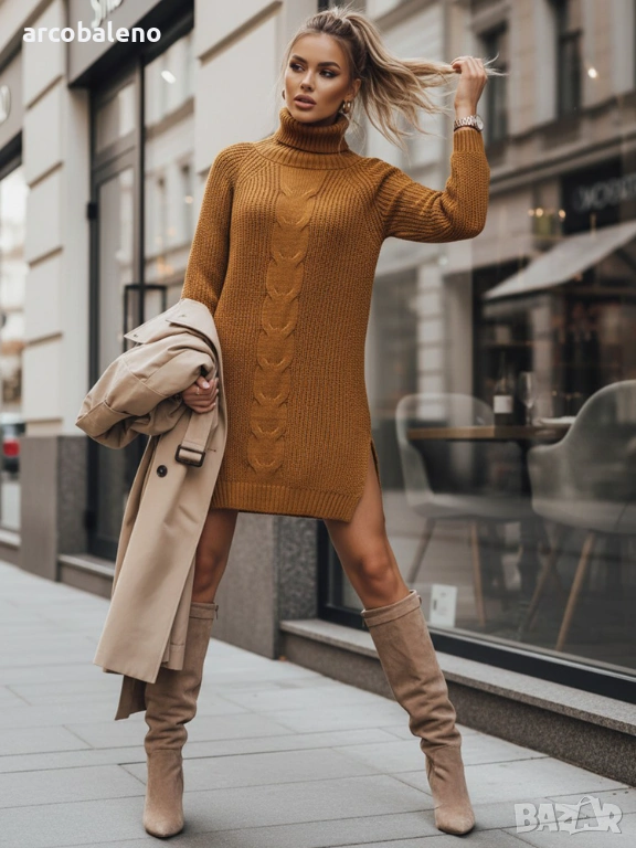 Този модел е идеален за есенни и зимни тоалети. Моделът с поло яка перфектно подчертава фигурата. Декоративни шевове преминават по цялата дължина на пуловера. Пуловерът ще се съчетае идеално както с панталон, така и с чорапогащник, като може да се носи и като рокля. Моделът се отличава с декоративни цепки отстрани.