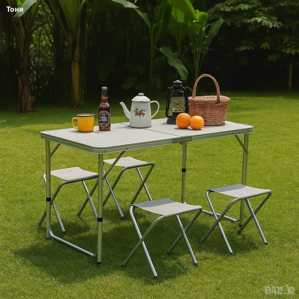 Комплект сгъваема алуминиева маса с 4 стола – идеален за къмпинг, двор и почивка, снимка 1 - Маси - 53091962 Комплект сгъваема алуминиева маса с 4 стола – идеален за къмпинг, двор и почивка, снимка 2 - Маси - 53091962 Комплект сгъваема алуминиева маса с 4 стола – идеален за къмпинг, двор и почивка, снимка 3 - Маси - 53091962 Комплект сгъваема алуминиева маса с 4 стола – идеален за къмпинг, двор и почивка, снимка 4 - Маси - 53091962 1/4