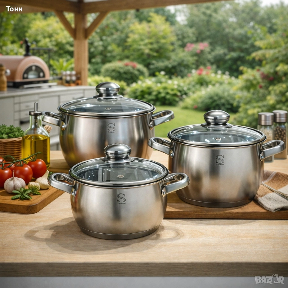 Комплект тенджери Swissgold EMMIE (SG-18099) – 3 броя с 5-слойно капсуловано дъно, снимка 1 - Прибори за хранене, готвене и сервиране - 53092042 Комплект тенджери Swissgold EMMIE (SG-18099) – 3 броя с 5-слойно капсуловано дъно, снимка 2 - Прибори за хранене, готвене и сервиране - 53092042 Комплект тенджери Swissgold EMMIE (SG-18099) – 3 броя с 5-слойно капсуловано дъно, снимка 3 - Прибори за хранене, готвене и сервиране - 53092042 Комплект тенджери Swissgold EMMIE (SG-18099) – 3 броя с 5-слойно капсуловано дъно, снимка 4 - Прибори за хранене, готвене и сервиране - 53092042 Комплект тенджери Swissgold EMMIE (SG-18099) – 3 броя с 5-слойно капсуловано дъно, снимка 5 - Прибори за хранене, готвене и сервиране - 53092042 1/5