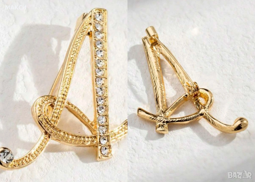 Красива брошка персонална буква в златисто с бели кристали → Обява 53092239