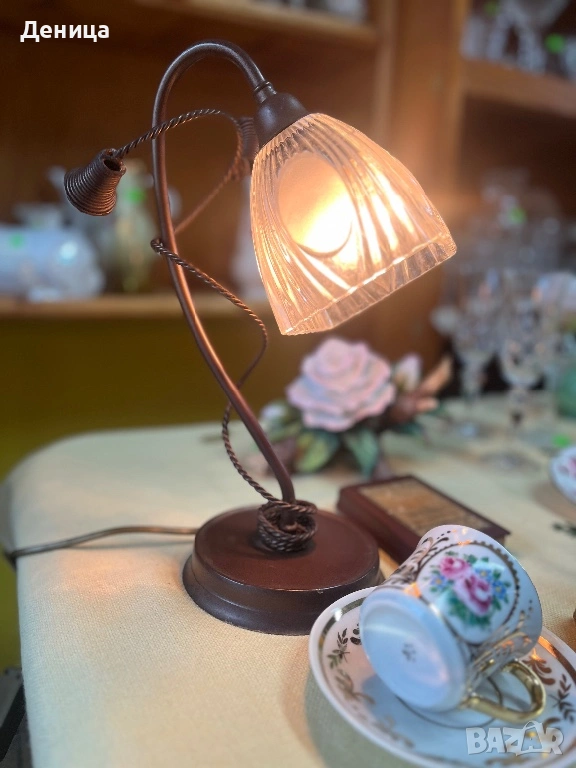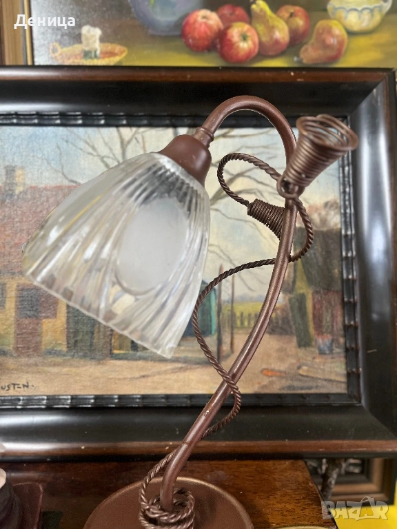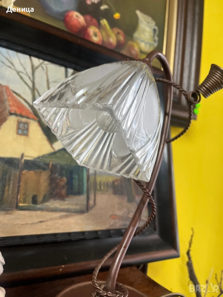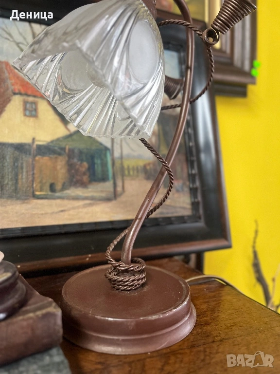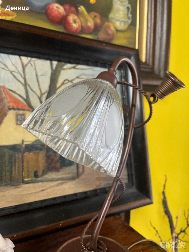 Настолна лампа във винтидж стил, метално тяло и оребрен стъклен абажур. → Обява 53092370