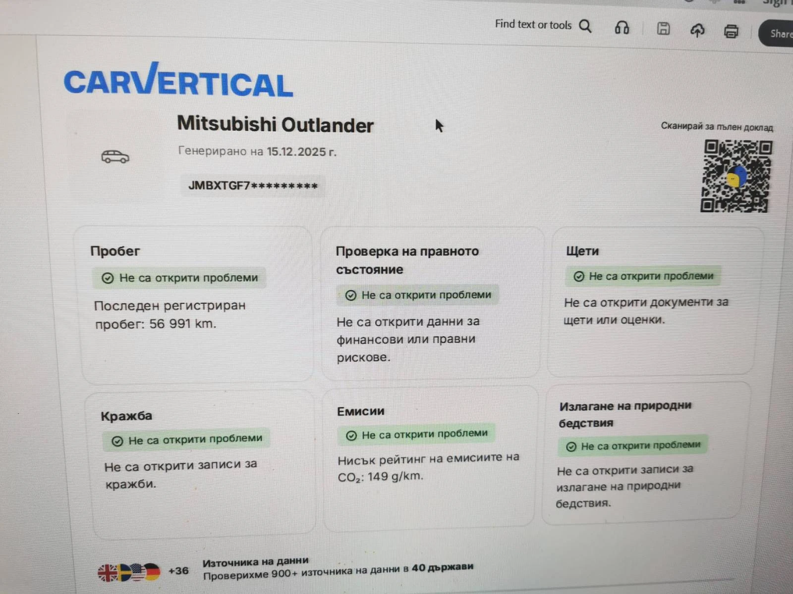 Mitsubishi Outlander 2. 0, 4x4 европейска версия - комфорт, сигурност и икономия, отличен семеен и туристически автомобил. Подходящ както за лятна, така и за зимна почивка, благодарение на надеждното 4х4 задвижване. Автомобилът е с газова уредба, което позволява много ниски разходи и комфортно пътуване на дълги разстояния. Просторен, удобен и стабилен, с голям багажник - идеален за планина, море и ежедневна употреба. Предимства: 4x4 сигурност при сняг, дъжд и лоши пътища, възможност за изключване 2WD и движение само на преден мост при дълго пътуване при добри условия, както и 4WD Lock при тежки условия и необходимост от използване на пълния потенциал на автомобила без значение от скоростта на движение. Автоматична скоростна кутия с пера на волана за ръчно управление дори в автоматичен режим и специален режим L (НИСКА) Това положение е за изкачване на много стръмни наклони и за спиране с помощта на двигателя при спускане с ниска скорост по стръмни наклони. Газова уредба - икономично и евтино пътуване Надежден японски автомобил с атмосферен бензинов 2, 0 4-цилиндров двигател с верига. Всесезонни гуми HANKOOK Kinergy 4s2 с ДОТ 1024 и 7 мм грайфер. Очакван внос от Италия, снимките са от момента на закупуване, без интервенции в България. Има външни забележки - пукнат елемент на бронята и леко ударена задна дясна врата - показани на снимките. Приложен доклад от carVertical - автомибил без щети и проблеми.