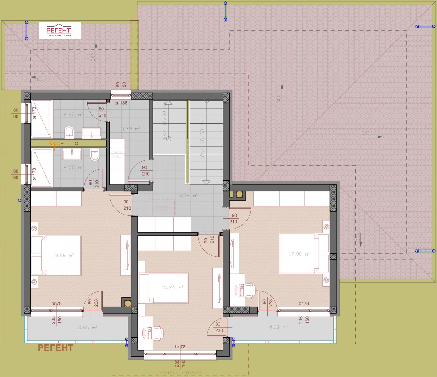 Три спални, две бани с тоалетни, мокро помещение и просторна тераса.