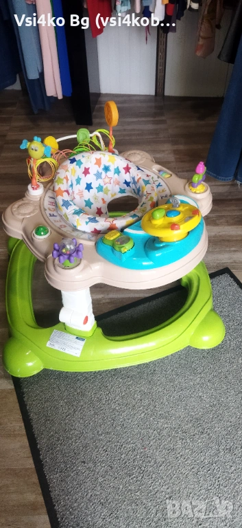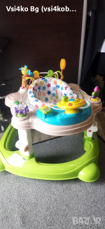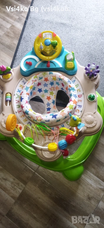 Може да се използва и като център за игра – има играчки от всички страни на въртящата се на 360 градуса седалка;