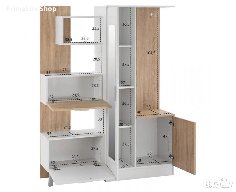 Антре Джелато - цвят бял-сонама Създайте добре организирано пространство на входа на къщата си. Размери: 125.5х37.5х166.5 см Размери на огледалото: 20х122 см Размери на рафта на централния шкаф: Рафт A: 27x30x36,5 см Рафт B: 27x30x37,5 см Рафт C: 27x30x36,5 см Рафт D: 27x35x37,5 см Размери на шкафа долу вдясно: Вътрешни: 38x35x47 см Размери на рафта горе вляво: 38,5х23,5х23,5 см Размери на шкафа ляв A: Вътрешни: 52x21.5x23.5 см Външни: 55x23.5-25x28.5 см Размери на шкафа ляво B: Вътрешни: 52x28,5x27,5 см Външни: 55x30-31,5x30 см Отворено пространство със закачалки: 40x35x104,5 см Разстояние на крака: 53x29 см Височина на стъпалото: 14 см Доставка до 10 дни