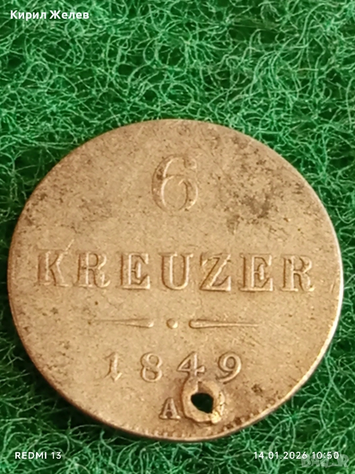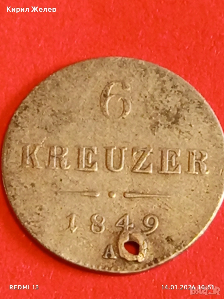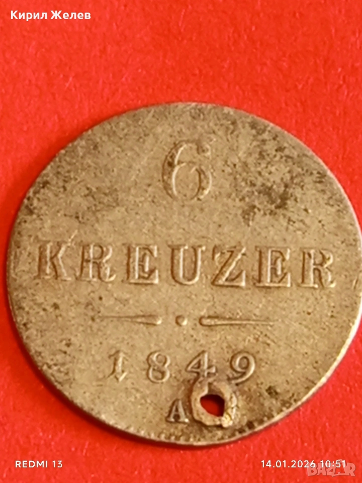 Сребърна монета 6 кройцера 1849г. Франц Йосиф Австрия за КОЛЕКЦИЯ 52891 → Обява 53093815