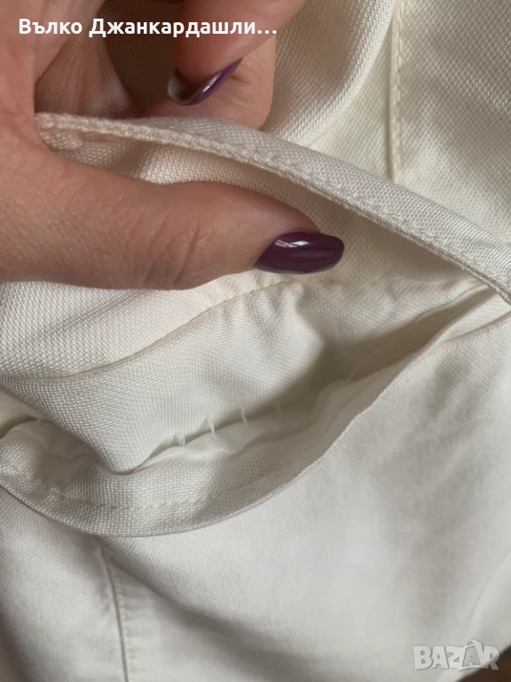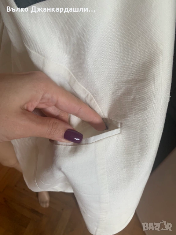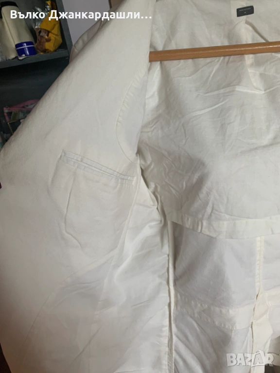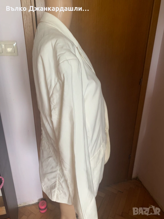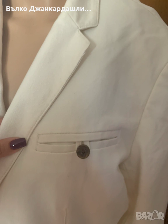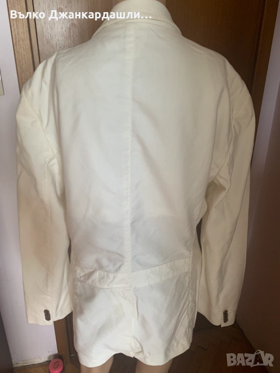 Сакото е отличен избор за пролетта и лятото. Съставът е памук и вискоза. Белият цвят го прави съчетаемо с много цветови комбинации. Може да бъде елемент както от по- строг стил, така и от спортно- елегантен. Изцяло зависи от останалите дрехи и обувките. Отлично се комбинира с мокасини в по- светъл цвят.