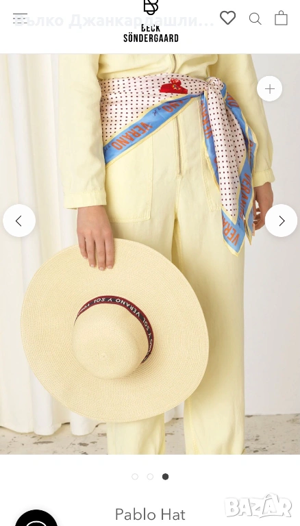 Разкошна капела на скандинавския бранд Becksöndergaard. Шапката е модел Pablo hat. С голяма периферия, надписи на испански. Много кокетна, закачлива и женствена. Перфектен аксесоар за плажа, който на практика се съчетава с всичко и е красив завършек на плажното облекло.