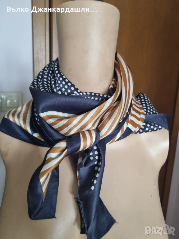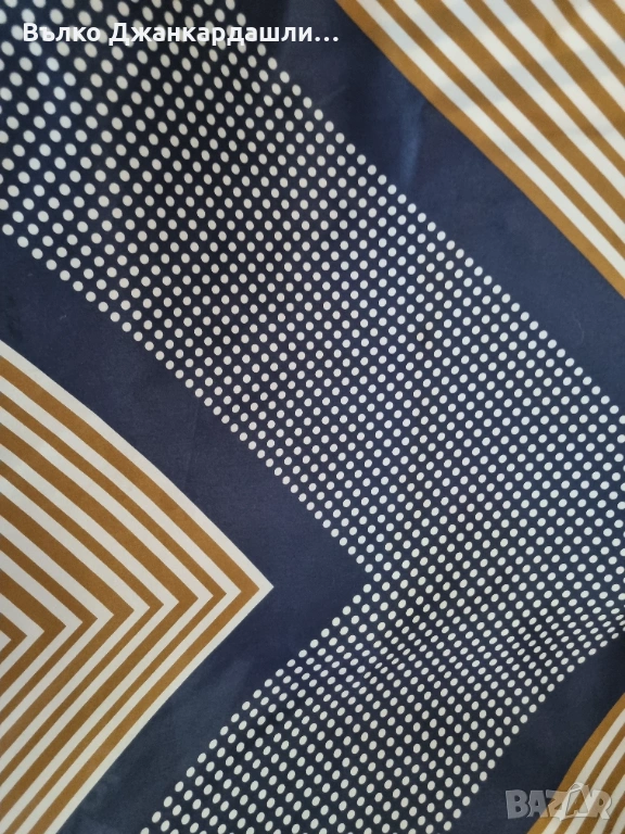 Акцент са белите точки на тъмносин фон. Ефектен и позволяващ много начини на връзване предвид големината си.