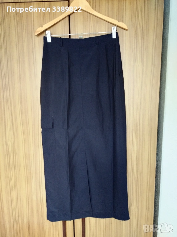 Продавам дългa пола - т.син цвят, права, дълга, немачкаем плат, закопчава се с цип и копче и има два джоба - отпред, един страничен джоб от лявата страна, с цепка отзад, дължина от талията до долу 96см, талия едностранно около 36см