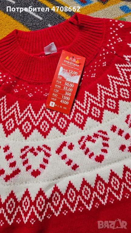 Продавам дамски коледен пуловер. Чисто нов е, с етикет. Размера е С. Изпращам с удобен за Вас куриер.