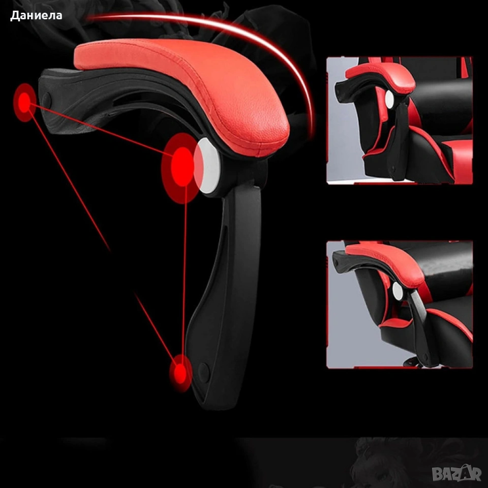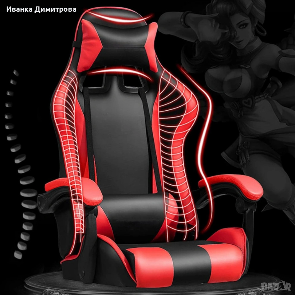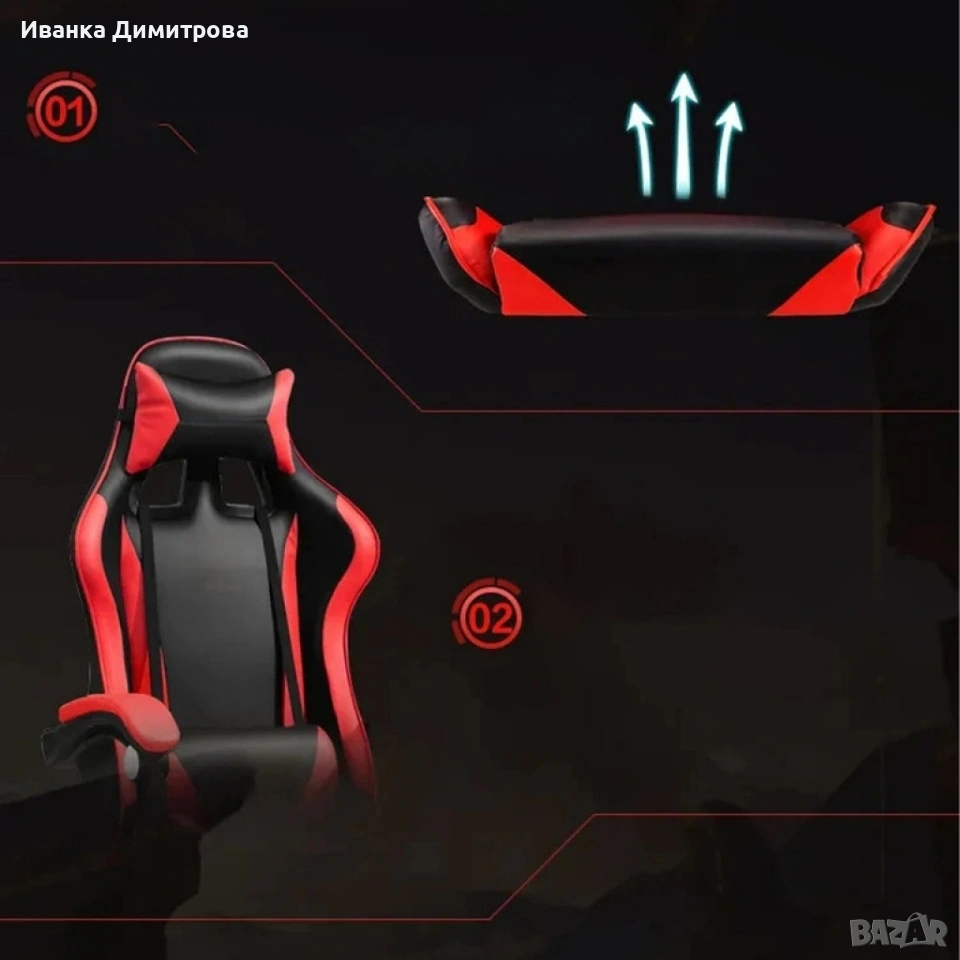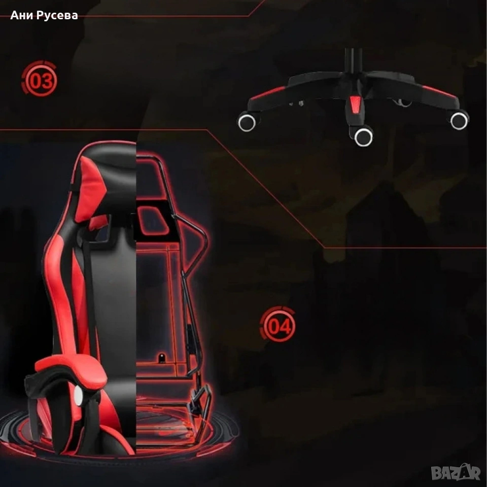 Геймърски стол; Форма на седалката: Тип „кофа“; Цвят: Червен, розов; Регулиране на височината: Да; Регулиране на наклона: Да; Въртене: 360°; Конструкция: Метална рамка; Основа: Петзвездна, с колелца; Тапицерия: Еко кожа; Пълнеж: Мека, еластична пяна; Възглавници: За глава и кръст; Максимално натоварване: до 150 кг; Размери: Обща височина: 112–122 см; Височина на облегалката: около 80 см; Ширина на облегалката (горна част): 52 см; Ширина на седалката: 38 см; Ширина между подлакътниците: 44 см; Височина на седалката от пода: 36–46 см; Диаметър на основата: около 60 см.