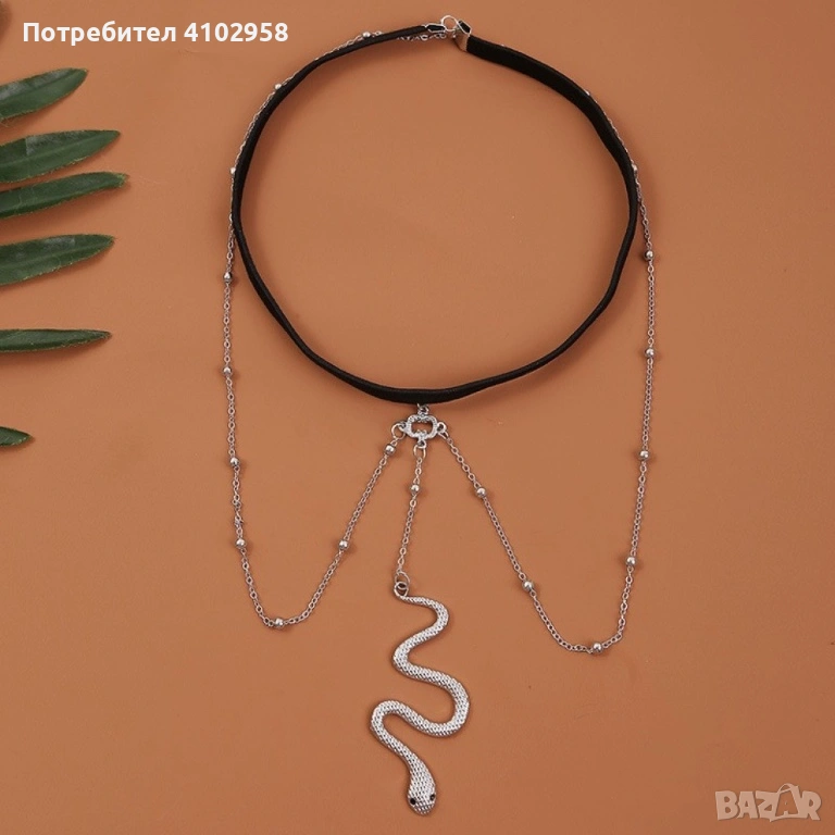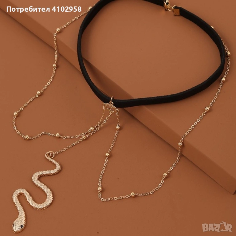 Стилно и модерно бижу с черен чокър и фина метална верижка със змия – символ на елегантност и женска сила. Подходящо за ежедневна визия и специални поводи. Леко, удобно и ефектно.
