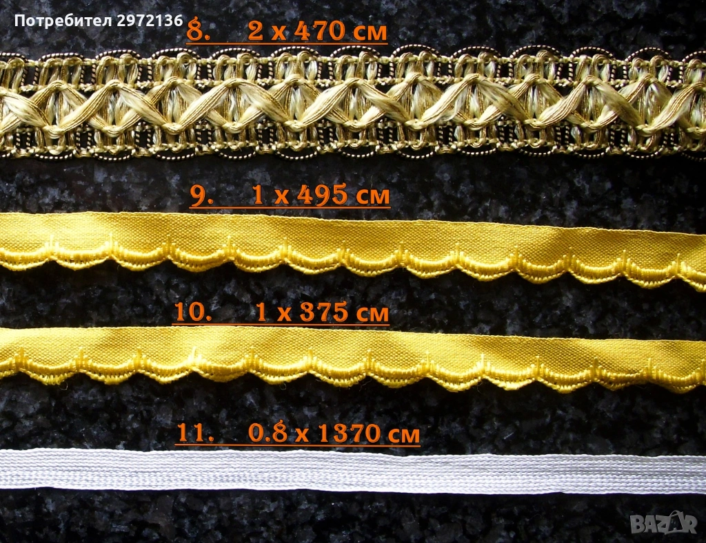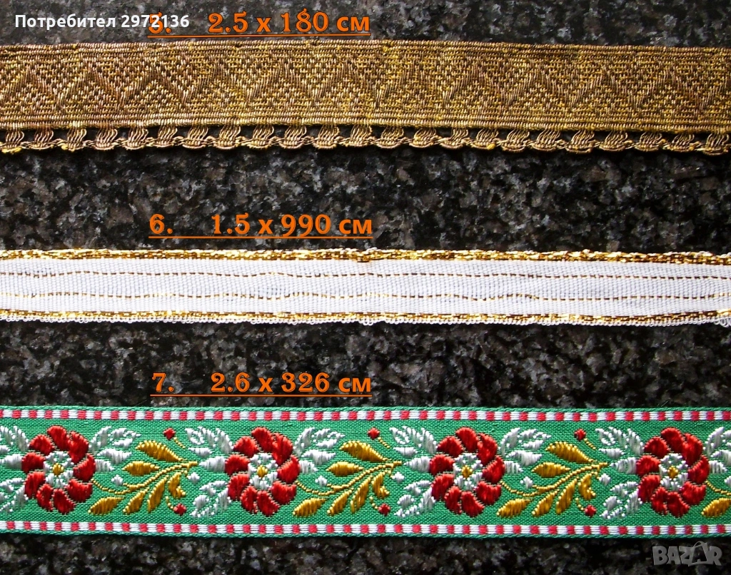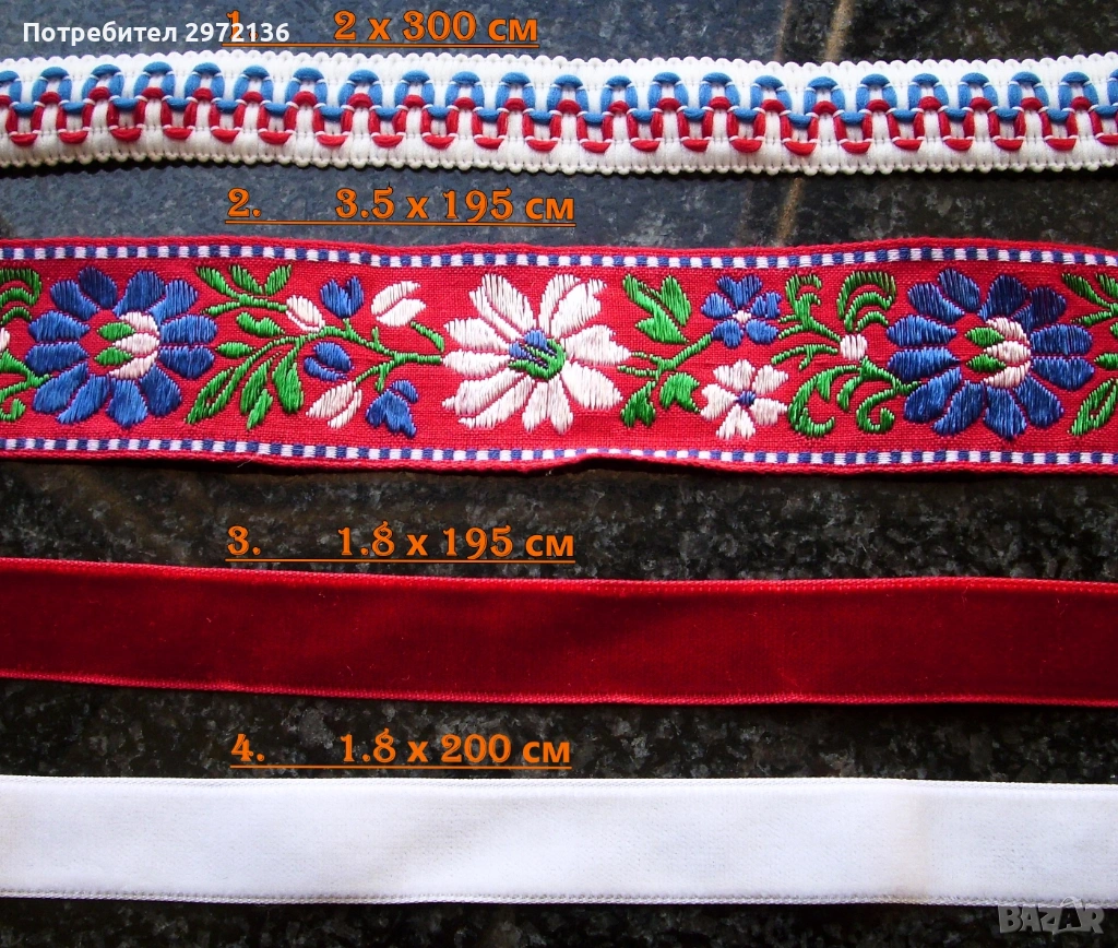 Декоративни ширити в 11 модела. Произход Чехия. Различни дължини, ширини и цветове. Цена за всички артикули комплект 160 €. Поединично цените са описани както следва:
