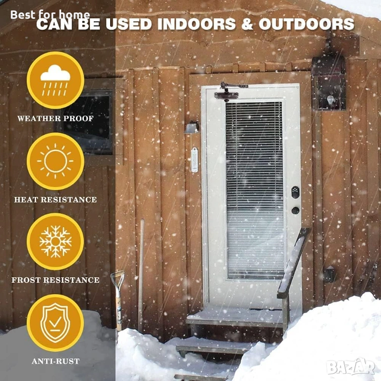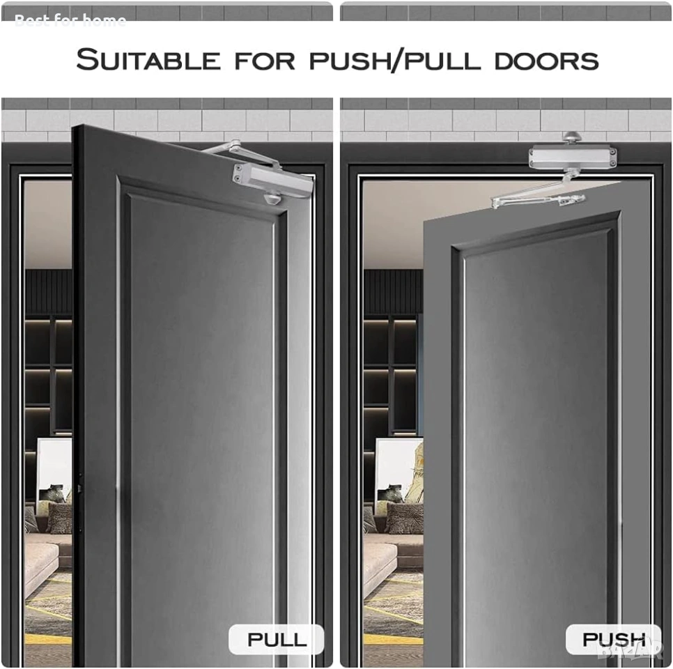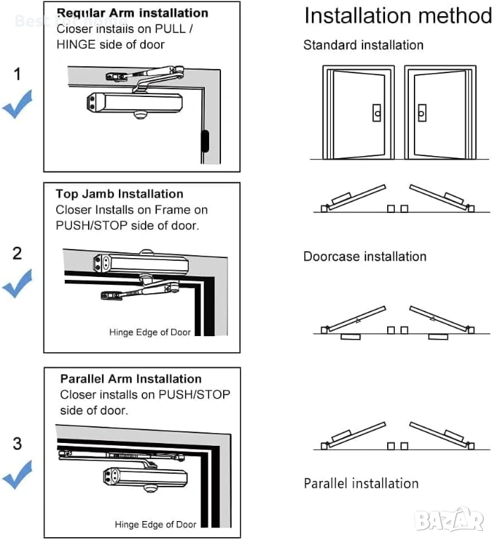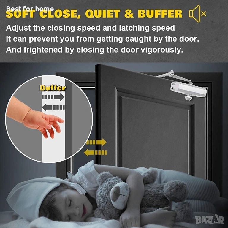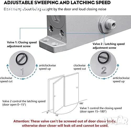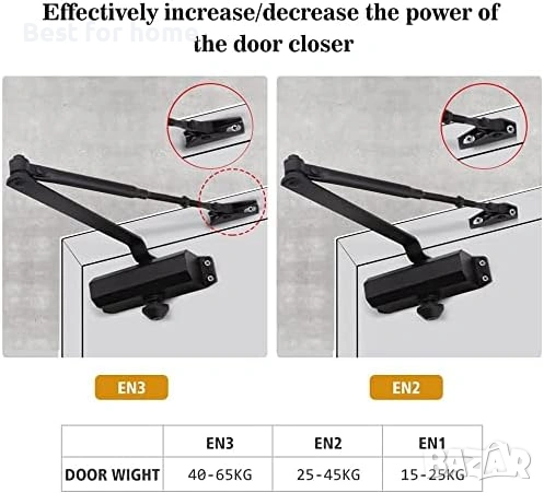 【Широко приложение】Аутоматът за затваряне на врати за дома е идеален за врати с размер до 80 см (32"). Допустимото тегло на вратата трябва да бъде между 25 и 45 кг (55 и 99 фунта). Всеки автомат за затваряне е снабден с скоба за паралелно рамо и монтажни елементи, което позволява универсален монтаж за стандартни, горни каси или приложения с паралелно рамо.