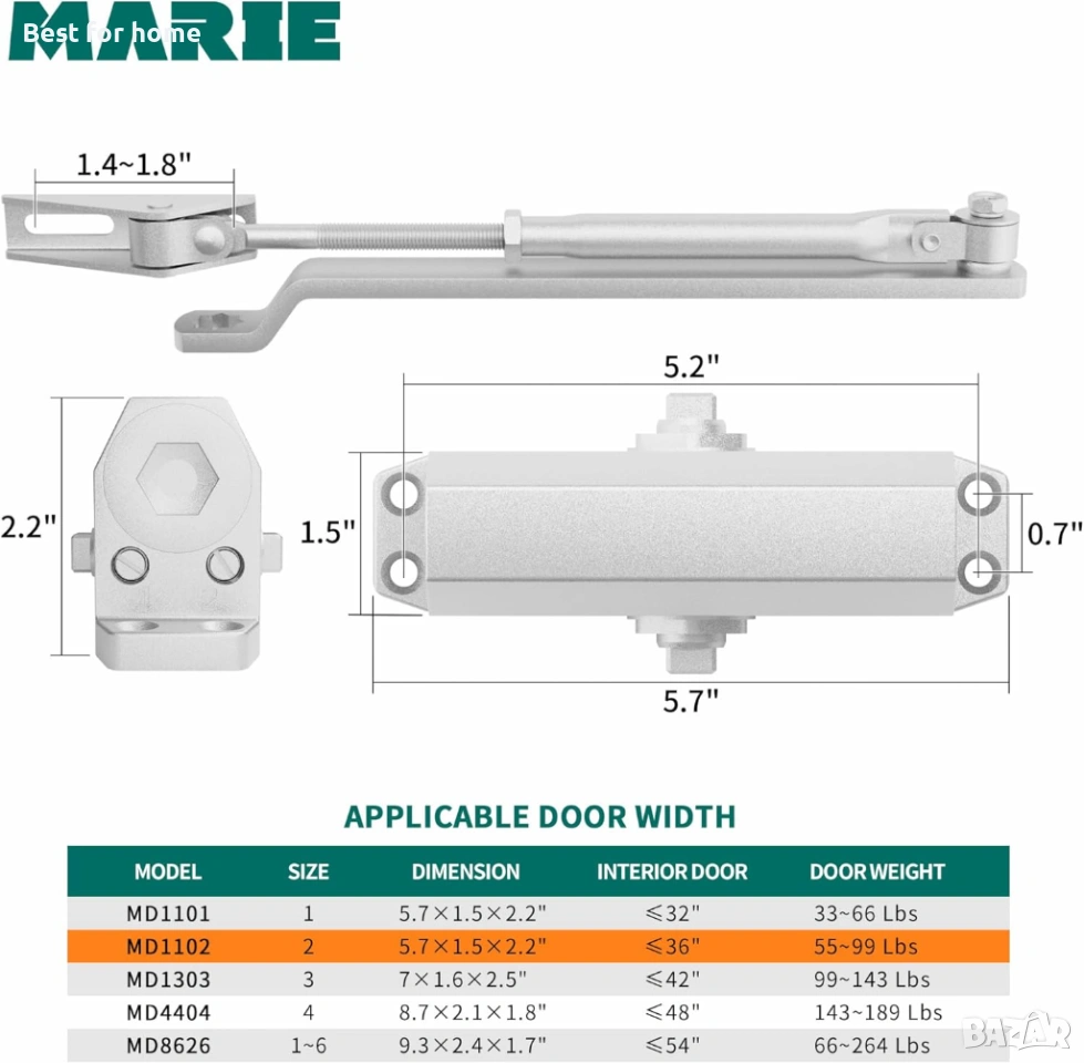 Автоматичен затварящ механизъм за врати Marie, размер 2, регулируема скорост на затваряне, за леки жилищни и търговски врати с тегло 55-100 фунта, с видео за монтаж, сертифициране по EN1154.