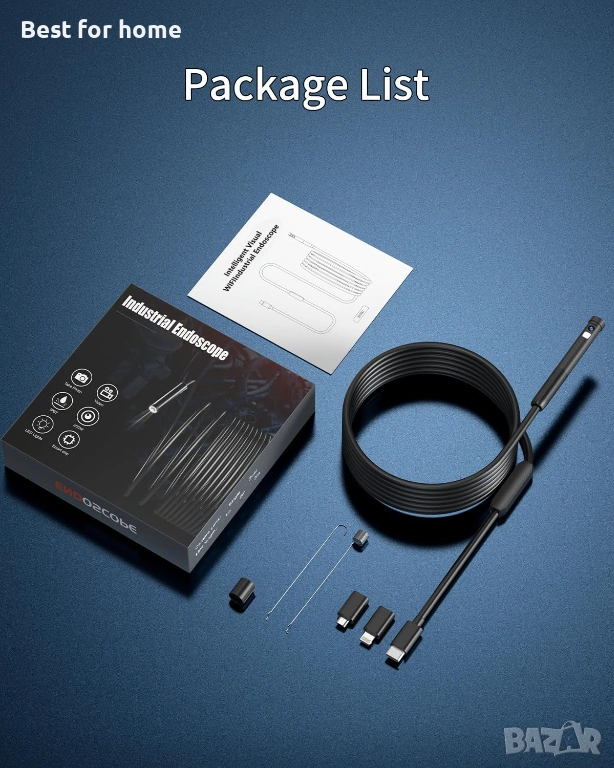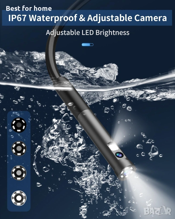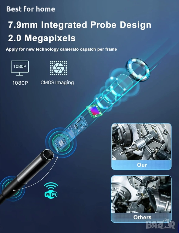 7,9 мм интегрирана сонда: С иновативен дизайн, HD камерата и смарт чиповете за Wifi са перфектно интегрирани в издръжливата интегрирана сонда с компактна структура. Чудесен помощник за труднодостъпни и тесни пространства, като например ОВК, вентилационни тръби, клапани на двигатели, тоалетни и др.