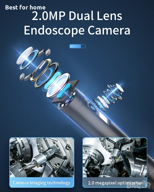 Ендоскоп с двойна леща: 1080P безжичен ендоскоп с двойна леща, предната леща може да достигне различни фокусни разстояния и е оборудван с достатъчно LED светлини, за да улесни визуализацията на всякакви запушвания или обекти. Фокусно разстояние на предната леща: 2-10 см, страничната леща: 2-5 см. Няма нужда от допълнително огледало, лесен за употреба.
