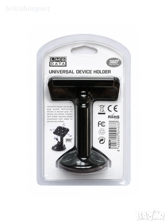 Универсална стойка за закрепване на мобилни устройства върху гладки повърхности, подходяща за използване в автомобил. Идеална за монтаж на предно стъкло или табло. Съвместима с широка гама устройства – телефони, таблети, GPS навигации и други. Благодарение на иновативната вакуумна вендуза с висока адхезия, стойката осигурява стабилно и сигурно захващане без необходимост от лепила или пробиване. Разполага с 360° свободно въртене, което позволява лесно регулиране на ъгъла на гледане според нуждите – в хоризонтална или вертикална позиция.