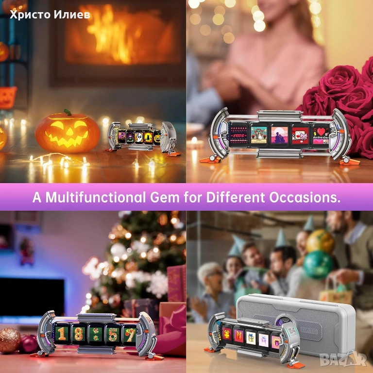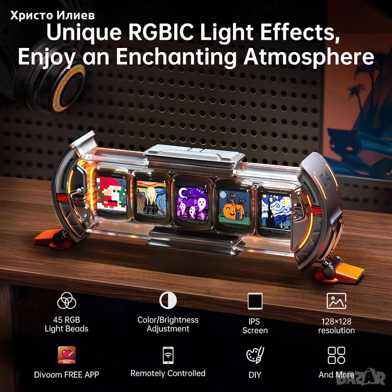 - Пикселов часовник: Този пикселен арт дисплей включва 5 пълноцветни IPS екрана. Часовникът или алармата могат да бъдат персонализирани, а IPS екранът показва до 128*128 пикселни снимки и GIF файлове, като всеки екран може да бъде конфигуриран индивидуално с различно съдържание.