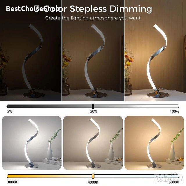 LED спирална настолна лампа с димиране – Модерна S-образна алуминиева