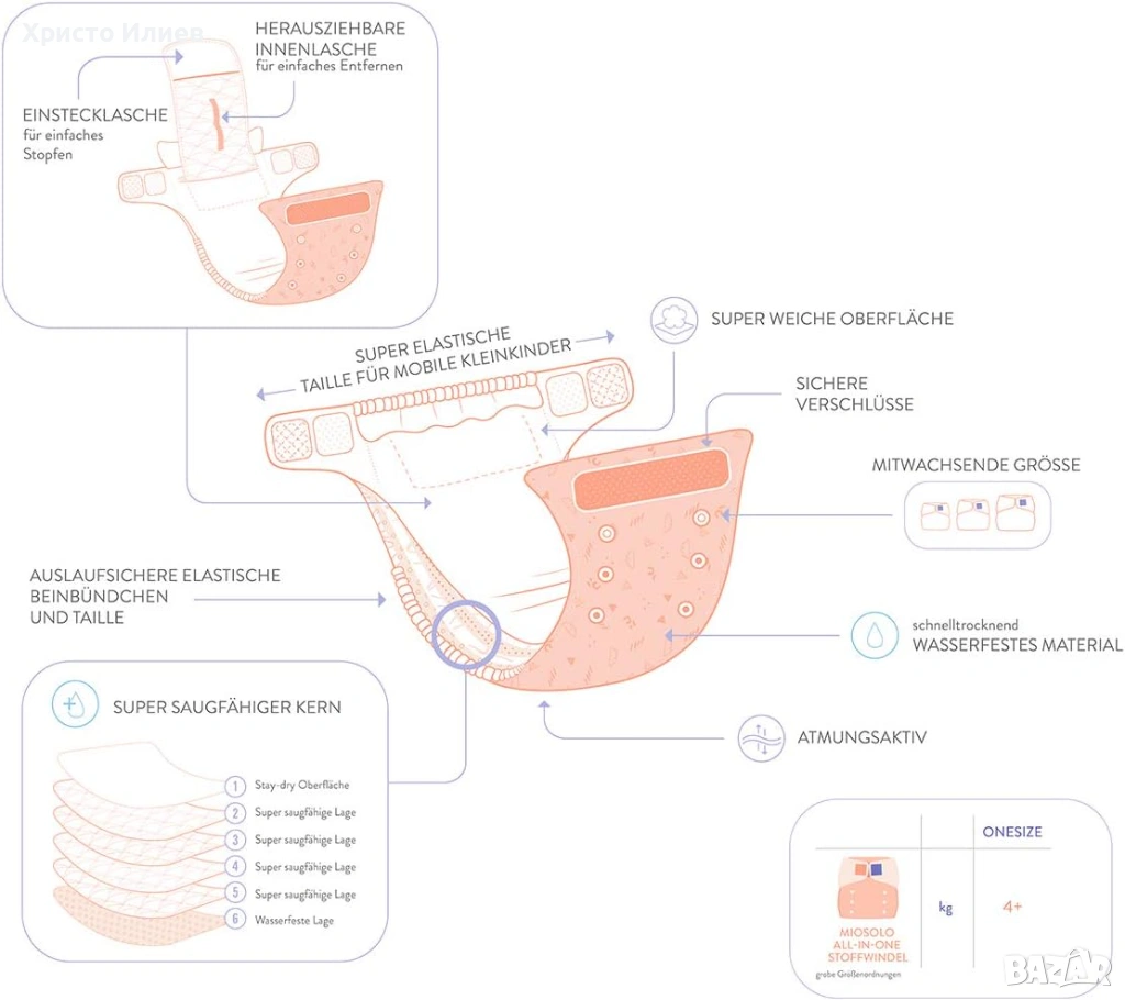 8 x платнени пелени miosolo „всичко в едно“, 3 x абсорбиращи подложки mioboost, 100 x поларени подложки за пелени, 1 x кофа за пелени, 2 x мрежички за пране