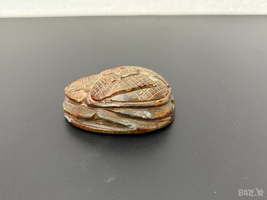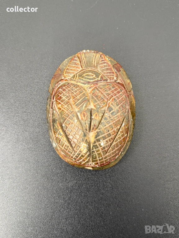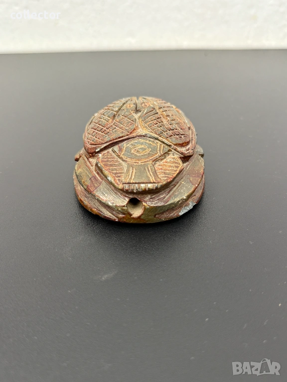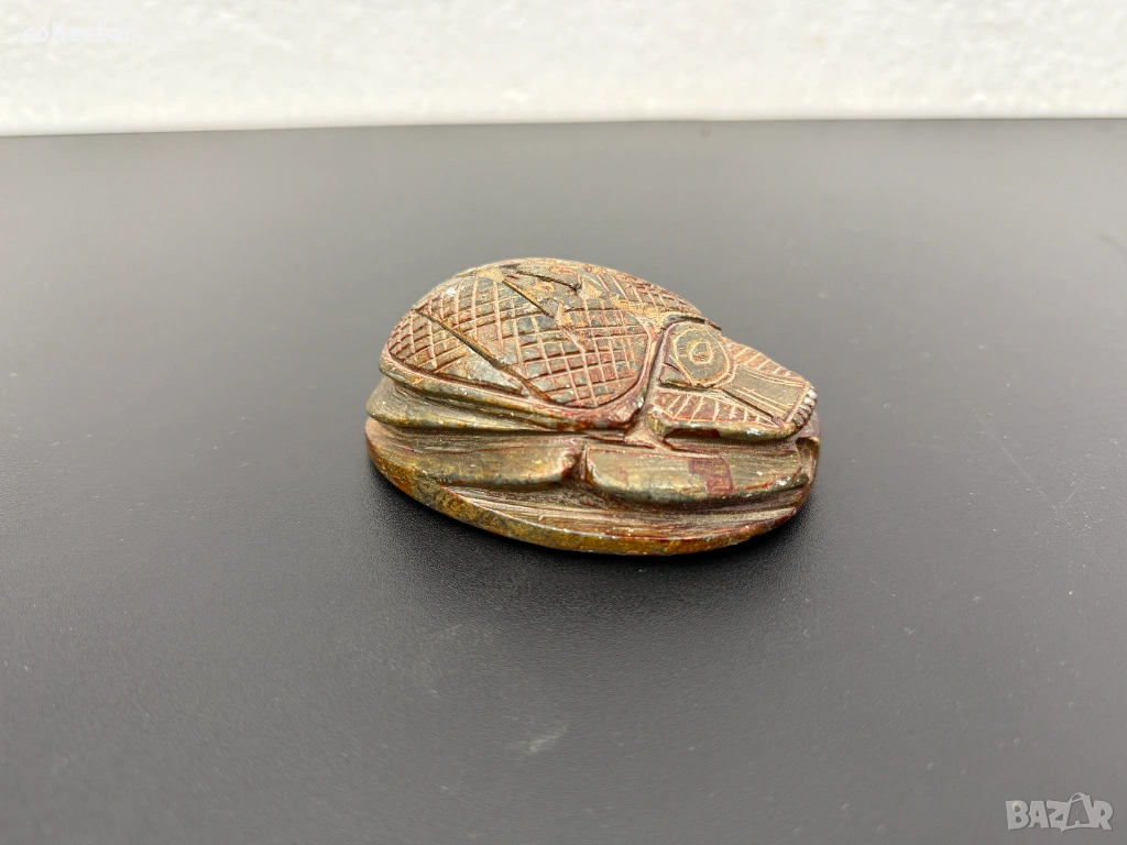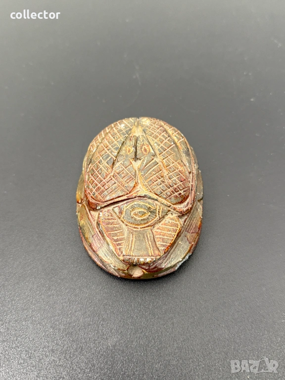 Каменна скулптура, изработена от минерал - стеатит. Същата е с форма на бръмбар, която е изключително популярен амулет в Древен Египет. Вярвали са, че служат за защита и късмет, а по-големите "сърдечни скарабеи" са били поставяни върху мумиите, за да осигурят безопасно преминаване в отвъдното по време на съда на Озирис.