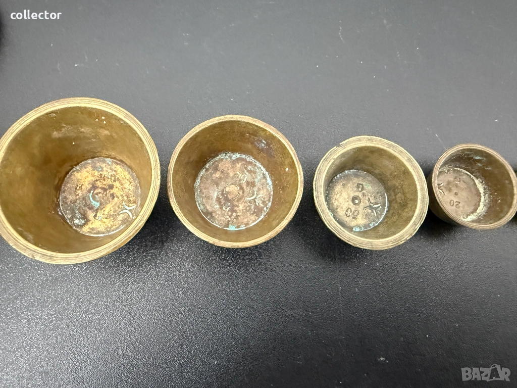 Бронзови тежести за везна, известни още като гнездови тежести. Калибрирани измервателни чаши, били използвани в миналото, най-вече от аптекари или търговци, за прецизно измерване на различни количества стоки.