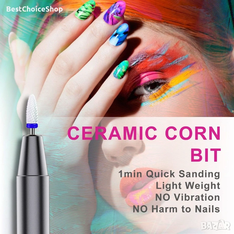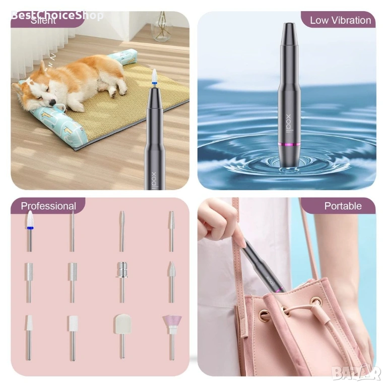 Това е комплект електрическа пила за нокти Xoali ND02. Това е професионален комплект пила 12 в 1, подходящ както за домашна, така и за салонна употреба. Устройството разполага с мощен мотор с 25 000 оборота в минута за ефективно оформяне на ноктите, пилене и премахване на кожички. Тялото с форма на химикалка е изработено от алуминиева сплав, което го прави леко, лесно за хващане и устойчиво на надраскване. Комплектът включва керамичен накрайник тип царевица, шест шлифовъчни накрайника, пет полиращи накрайника и шлифовъчни ленти.