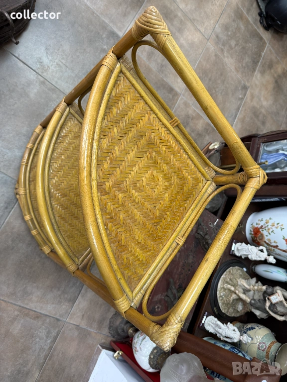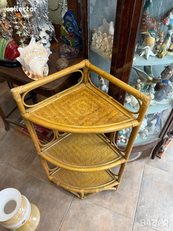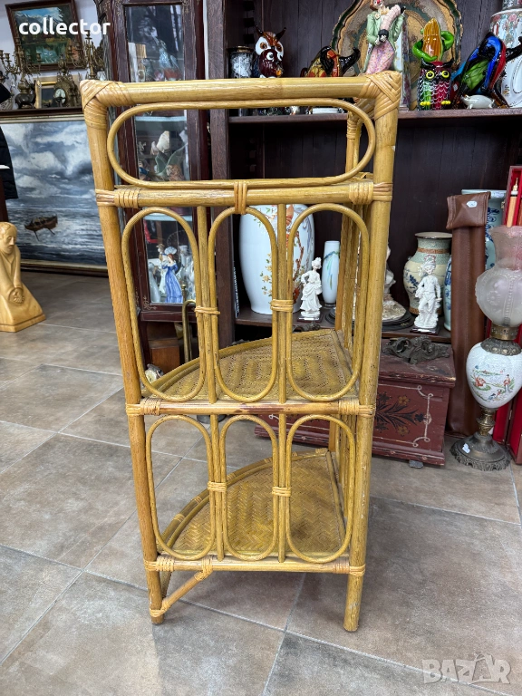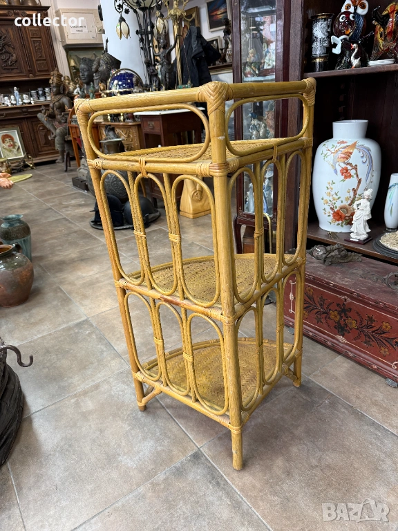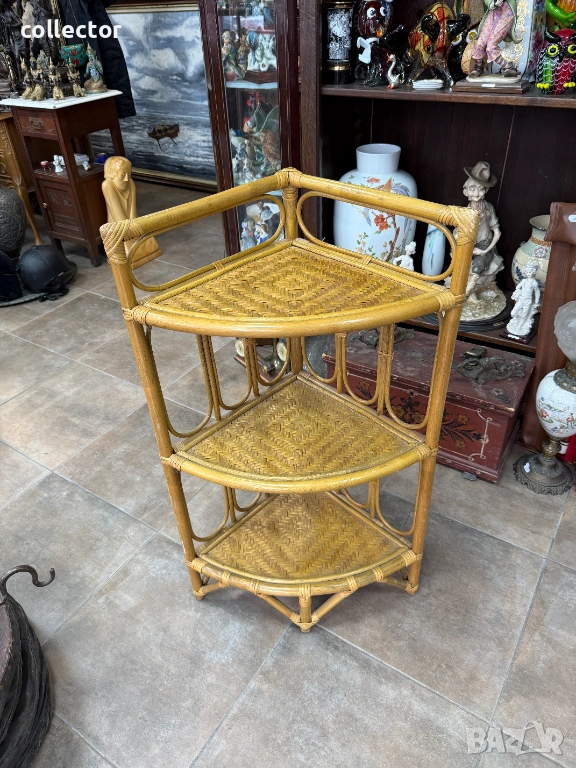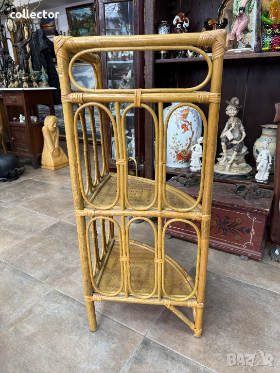 Този тип мебелировка е характерна за стиловете "Mid-Century Modern" или "Bohemian", била особено популярна през 60-те и 70-те години на миналия век. Изработена е от естествени материали – рамката е от бамбук, а рафтовете са от преплетен ратан.