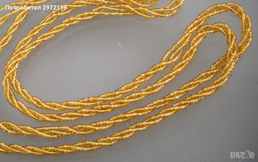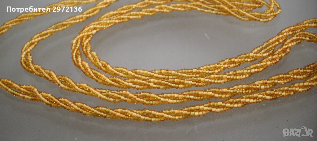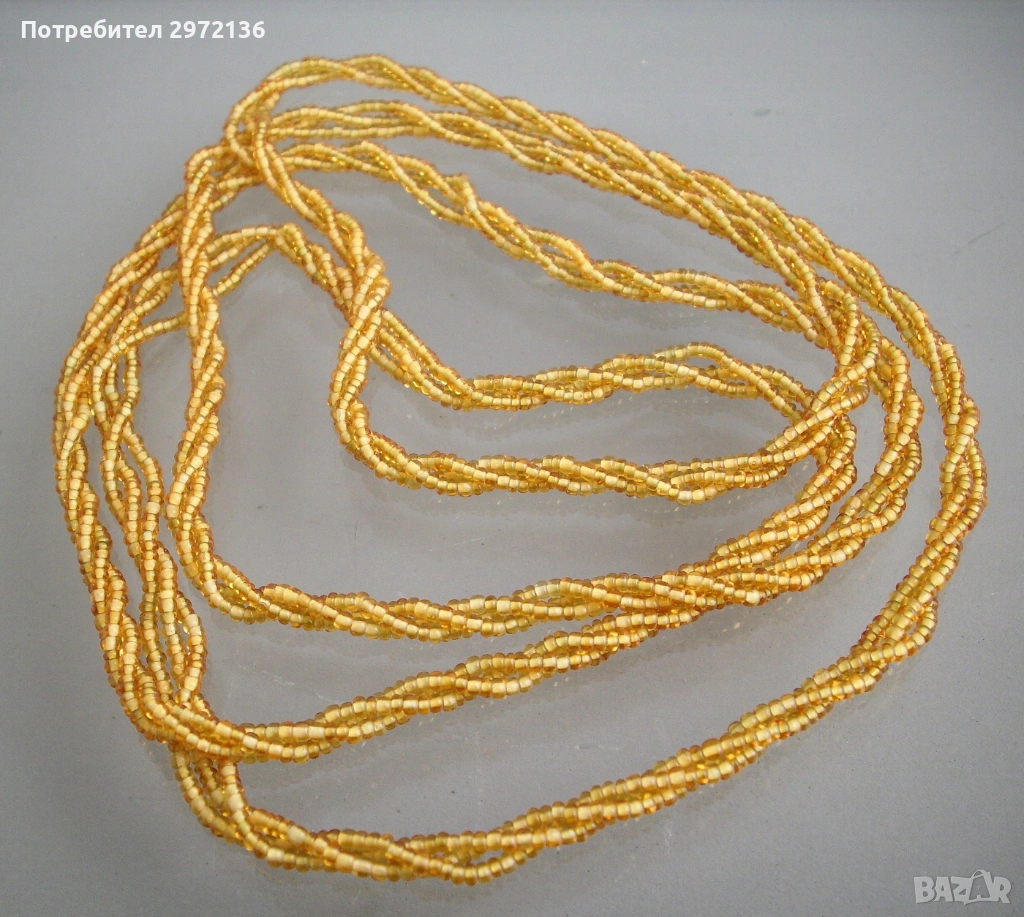 Колие дамски гердан, изработен от стъклени мъниста с кръгла форма. Производство Чехословакия. Герданът се състои от три усукани наниза. Мънистата са с големина между 1.5-2 мм, цвят злато, прозрачни. Всеки наниз е на бял памучен конец, който подчертава основния златен цвят. Малкият размер на мънистата придава гъвкавост на колието. Колието е с елегантна визия, с дискретни отблясъци от стъклото. Подходящо е за бизнес ежедневие. Може да се носи в един или два реда като колие или в шест реда като гривна. Разгъната дължина 118 см, ширина 0.5 см, без закопчалка.