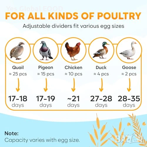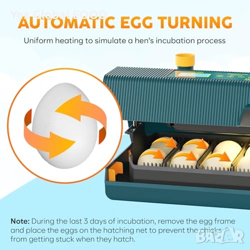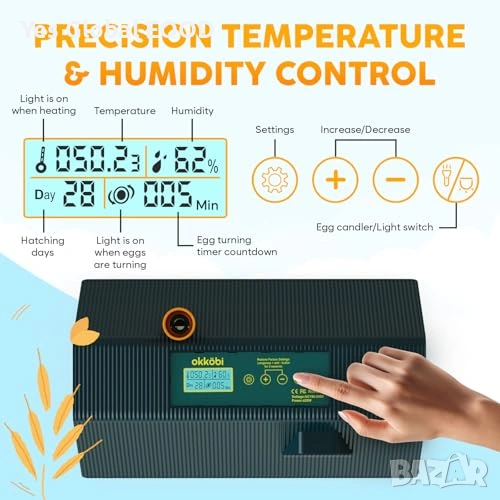 Инкубаторът разполага с автоматично обръщане на яйцата, прецизен контрол на температурата и влажността, както и вградена лампа за просветляване на яйцата. Прозрачният капак позволява наблюдение на процеса на инкубация без отваряне.