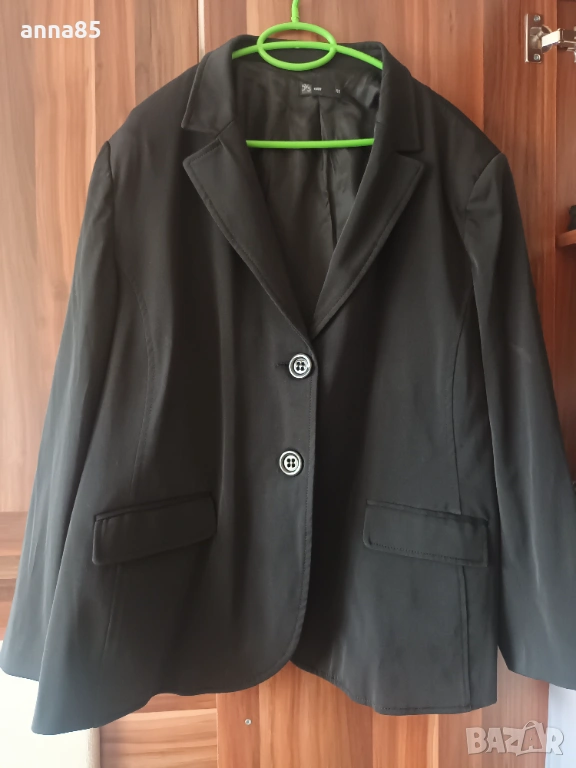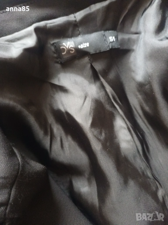 Продавам прекалено черно сако OVS + Size. Дължина от рамо до долу 71 см., ширина едностранно между мишниците при закопчано сако- 65см, ширина едностранно най-долу при ханша- 75см. Дължина на ръкава от рамото 63см, разстояние от рамо до рамо 52см. Няма никакви следи от употреба. Цена 20 еuro.