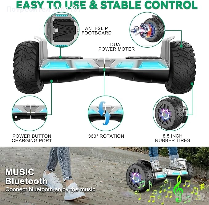 1. 8,5-инчови плътни офроуд ховърбордове: ховърбордът е с 8,5-инчови плътни гумени гуми, които осигуряват амортизиращо и комфортно шофиране, особено по всякакъв терен, като например черни, чакълести пътища и стръмни склонове. Можете да стигнете чак до парка, да се приключвате по градските алеи, както и да стигнете до другия край на кампуса.