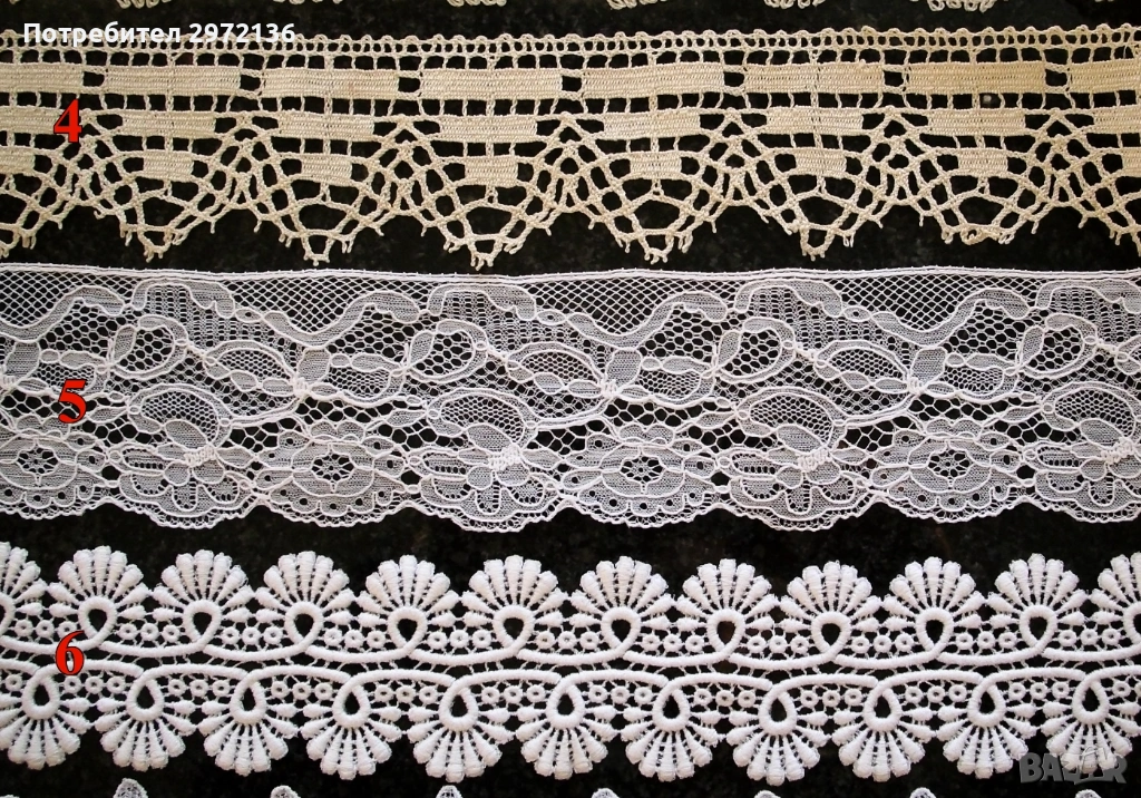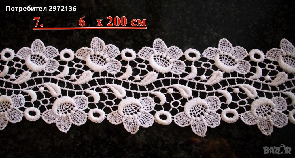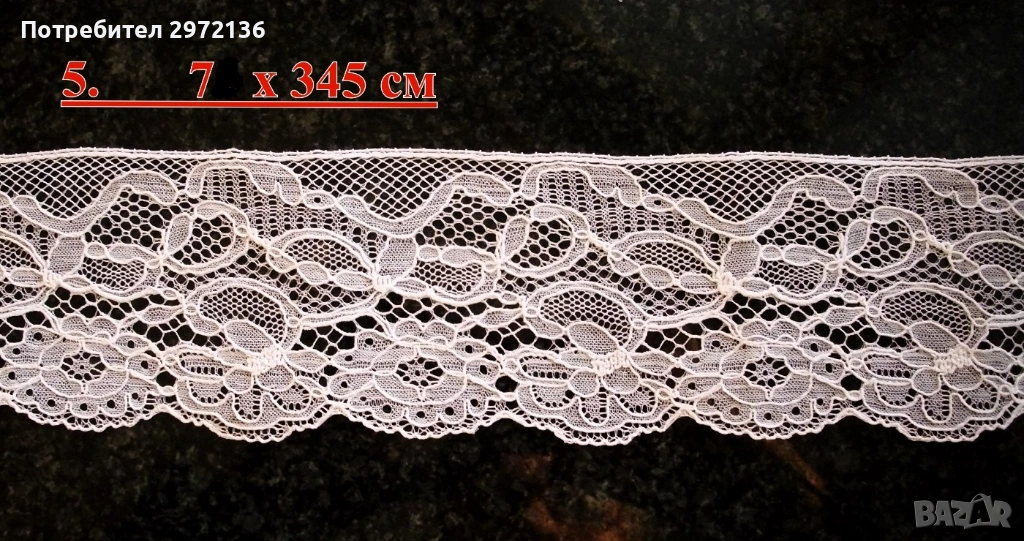 5. Дантела, памук, цвят бял, ширина 7 см, дължина 345 см, цена 19 €;