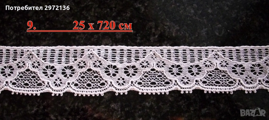 9. Дантела, памук, цвят бял, ширина 2.5 см, дължина 720 см, продадена;