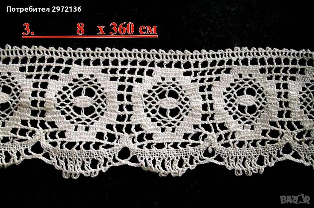 3. Дантела, памук, цвят екрю, ширина 8 см, дължина 360 см, цена 23 €;
