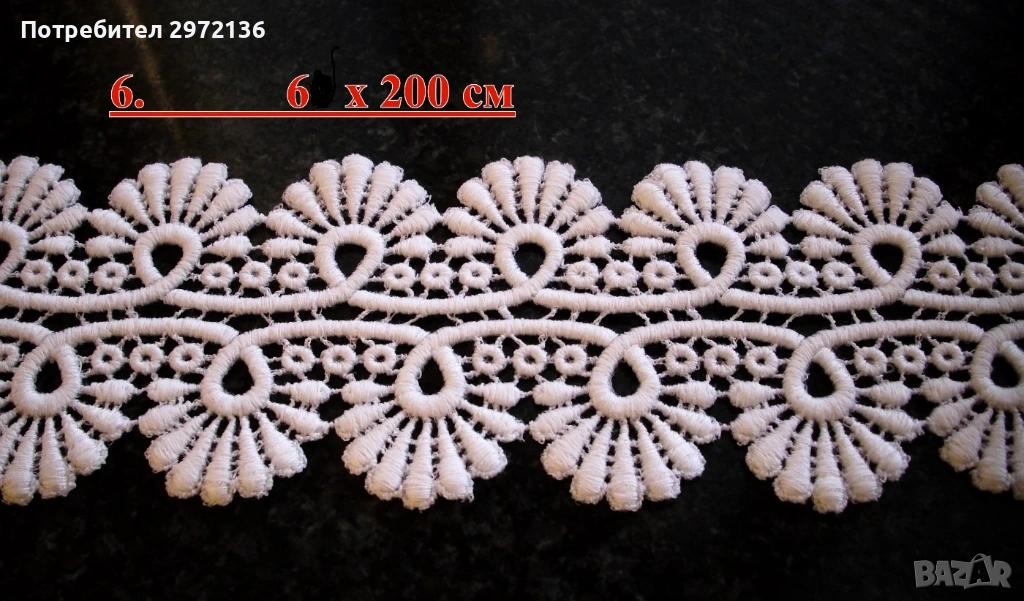 6. Дантела брюкселска, памук, цвят бял, ширина 6 см, дължина 200 см, цена 17 €;