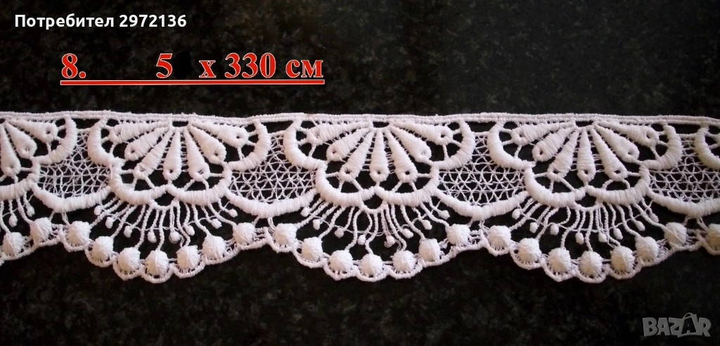 8. Дантела брюкселска, памук, цвят бял, ширина 5 см, дължина 330 см, цена 26 €;