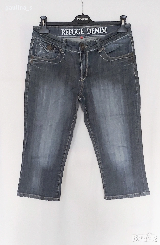 4️⃣ L / XL - "Refuge" Denim. Цената е крайна, без пазарлъци. Винтидж еластични дънкови бермуди прав стандартен модел "5 pocket denim". Имат избелващ, протрит и накъсан ефекти на ключовите зони. Изнищени са фабрично на някои места, а на задните джобове има капаци и бродерии. Няма дрехи с такова качество вече.