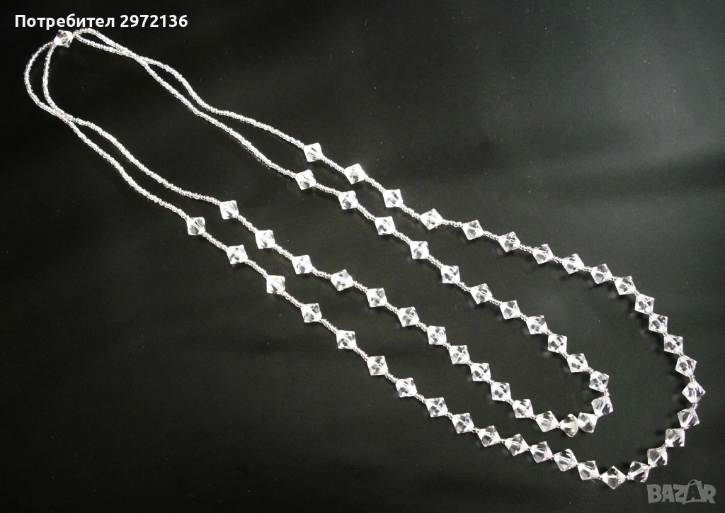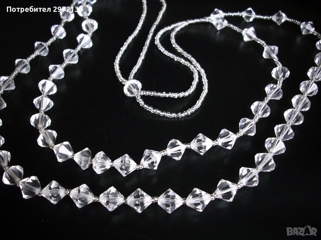 Стилно двойно колие огърлица, изработено от фасетирани кристали и кристални мъниста. Ръчно производство Чехословакия. Колието е тежко, с елегантен дизайн, на корда, без закопчалка. Фасетираните кристали (61 броя) с форма на призма пречупват светлината и създават блестящ ефект с цветни отблясъци. Разгъната дължина на дългия ред 84 см, на по-късия ред - 70 см. Размери: на призмите 10х10 мм, на мънистата 2 мм.