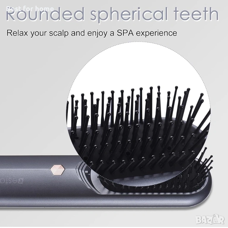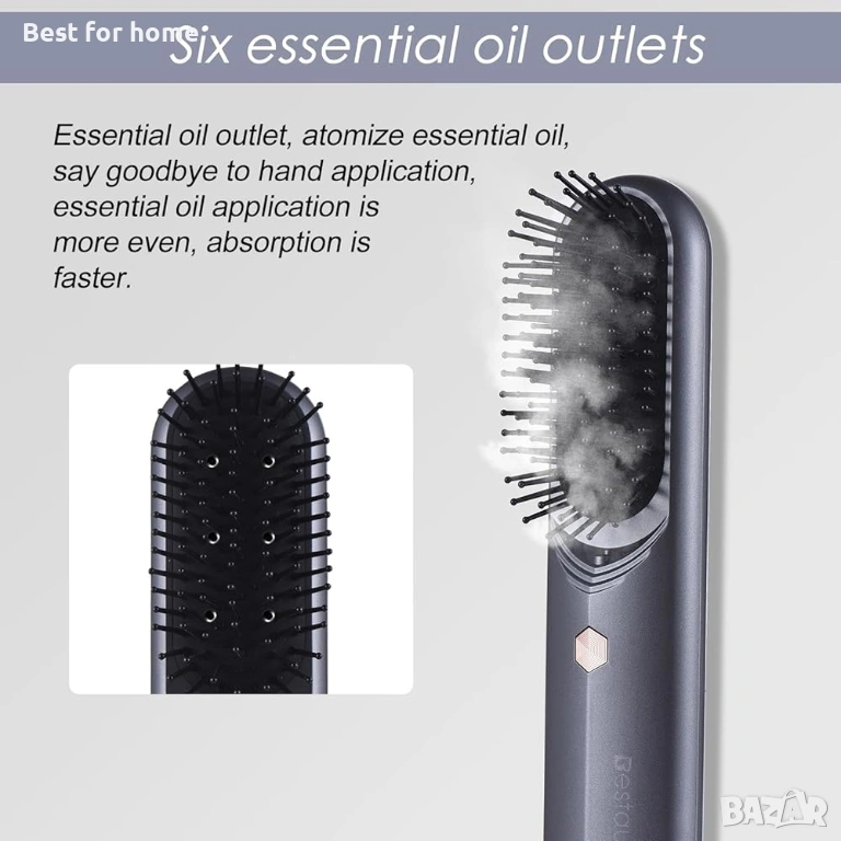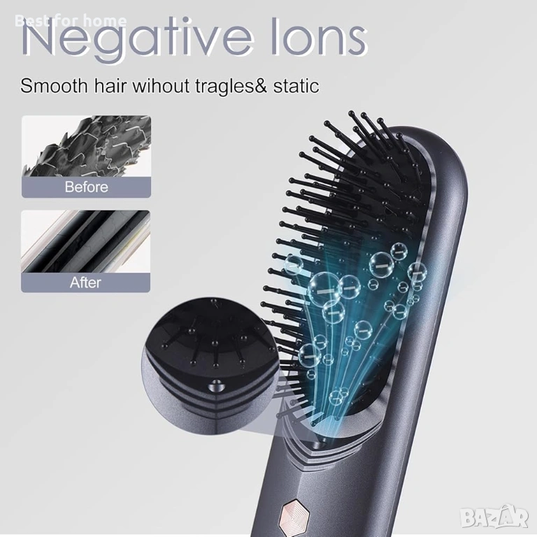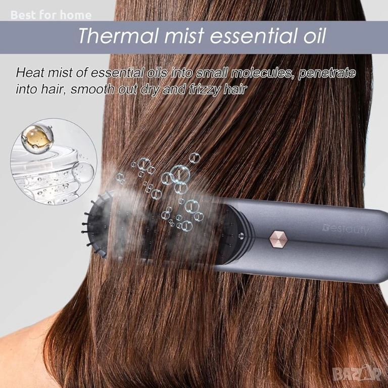 Поглезете косата и сетивата си с този мултифункционален безжичен уред на Bestauty. Той съчетава силата на отрицателните йони с релаксиращ вибрационен масаж на скалпа. Уникалната му характеристика е функцията за атомизация, която позволява равномерно разпръскване на етерични масла или серуми за коса директно по време на разресване. Идеално решение за справяне със хвърчащата коса (frizz), подхранване на фоликулите и намаляване на стреса.