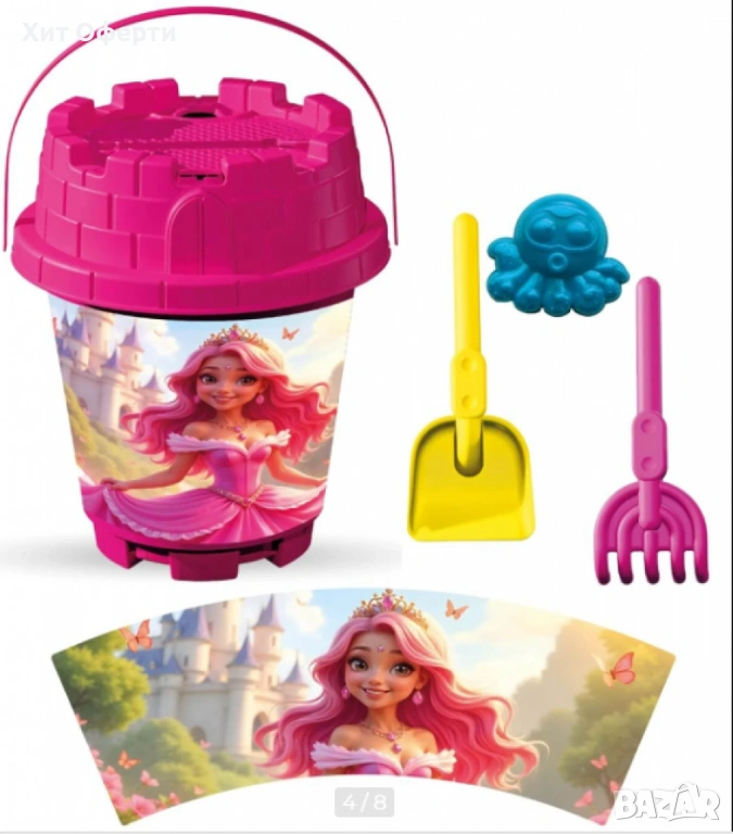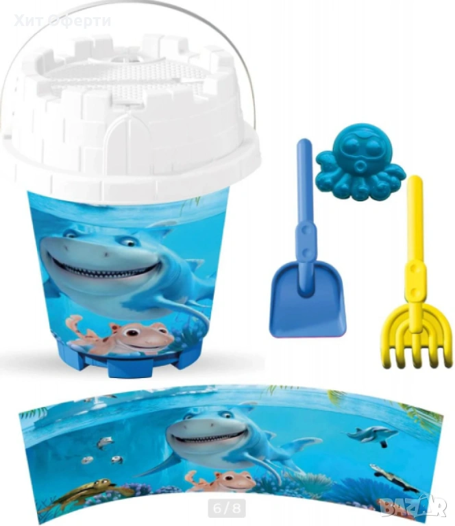 Този комплект с голяма кофа за пясък е перфектният избор за весела и творческа игра на плажа или в пясъчника. Подходящ за момичета и момчета над 3 години, комплектът съдържа всичко необходимо за забавление край морето – удобно събрано в практична мрежеста опаковка.
