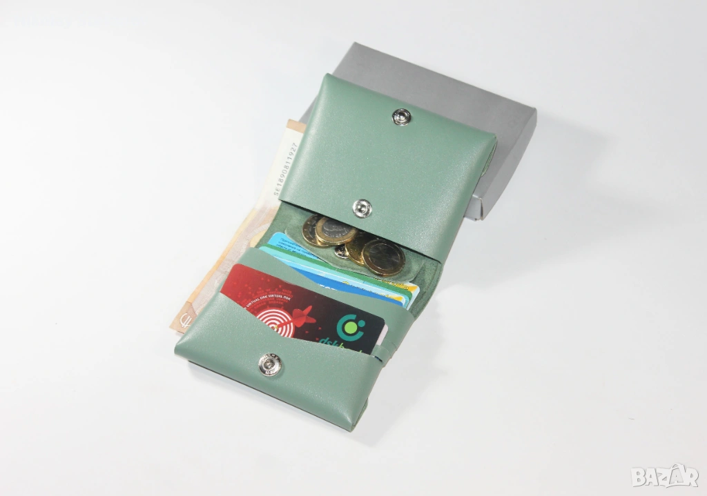 - Разполага с 3 слота за карти, които побират общо 6 карти, отделение за банкноти, голям монетник и 1 допълнително отделение за още карти и визитки