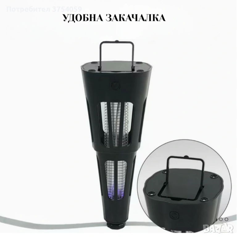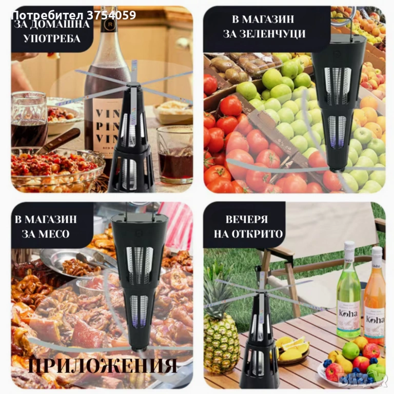 Функции: UV/бяла светлина за привличане, система за улавяне, преносим вентилатор, безопасен за храна;