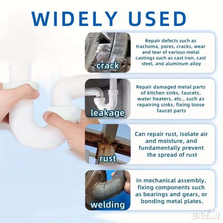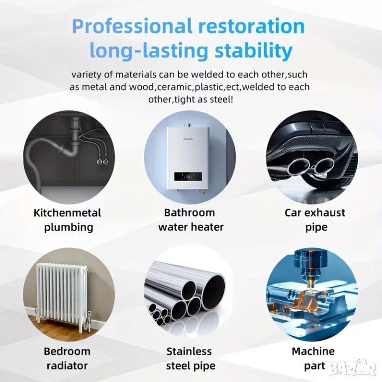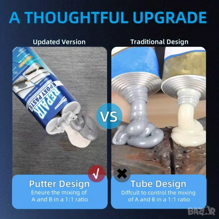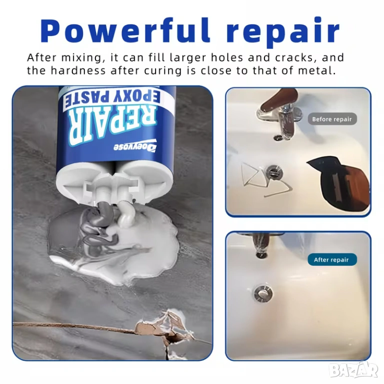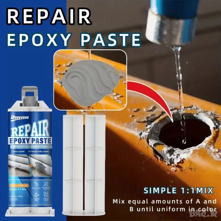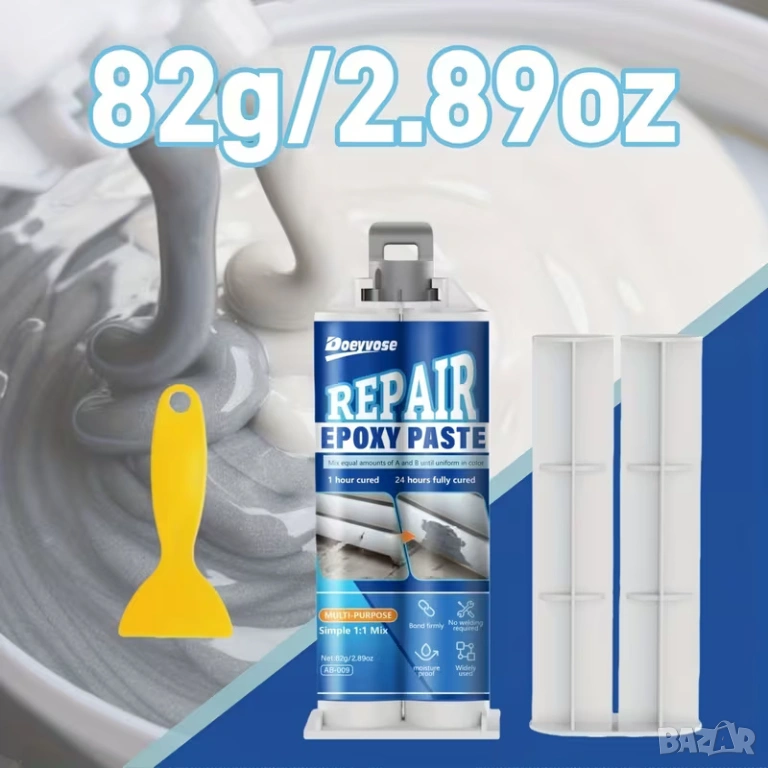 Doeyvose епоксидна паста за ремонт е висококачествен материал, предназначен за запълване, лепене и възстановяване на метални, пластмасови, дървени и други повърхности при ежедневни ремонти, хоби проекти и индустриална употреба. Тази пластична епоксидна паста осигурява здраво и дълготрайно свързване и е особено полезна там, където е необходимо поправяне на пукнатини, износване, корозия или липсващи части.