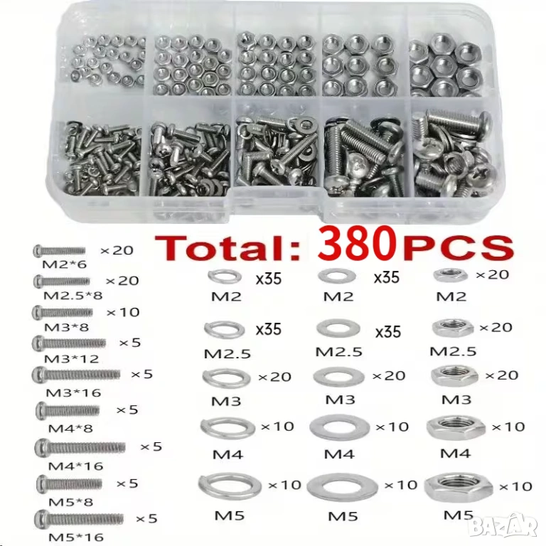 Този комплект гайки и болтове (nuts & bolts) съдържа множество метрични крепежни елементи с различни размери — включително M2, M2.5, M3, M4 и M5, което го прави универсално решение за всякакви монтажни и ремонтни задачи. В комплектите обикновено се включват както болтове с шестоъгълна глава, така и съвпадащи гайки и шайби, за да може да монтирате стабилни и здрави връзки между метал, пластмаса, дърво и други материали.