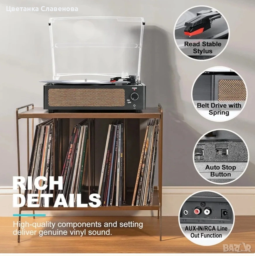 1. Автоматично спиране/Свалящ се капак/Винтидж вид 2. Грамофон с вграден Bluetooth приемник (Bluetooth вход) 3. AUX/вход за слушалки и RCA линеен изход 4. Антивибрационна система за грамофон с ремъчно задвижване 5. Вградени високоговорители на грамофона 6. 3 избираеми скорости и адаптер за 45 оборота в минута 7. Всичко в едно, лесен за употреба1. Автоматично спиране/Свалящ се капак против прах/Винтидж вид 2. Грамофон Вграден Bluetooth приемник…