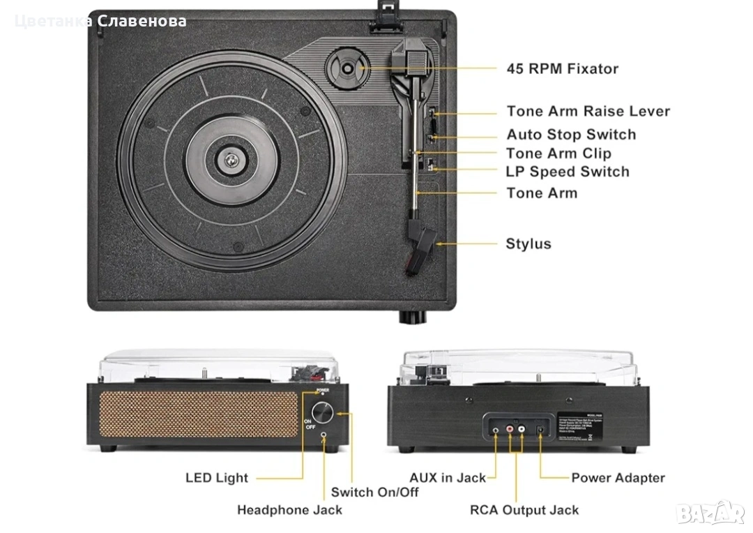 1. Грамофон R608 2. Захранващ адаптер (DC 5V 1000mA) 3. Адаптер за 45 об/мин 4. Ръководство за употреба 5. Свалящ се капак за прах 1. Грамофон R608 2. Захранващ адаптер (DC 5V 1000mA) 3. Адаптер за 45 об/мин 4. Ръководство за употреба 5. Свалящ се капак за прах1. Грамофон R608 2. Захранващ адаптер (DC 5V 1000mA) 3. Адаптер за 45 оборота в минута 4. Инструкция…